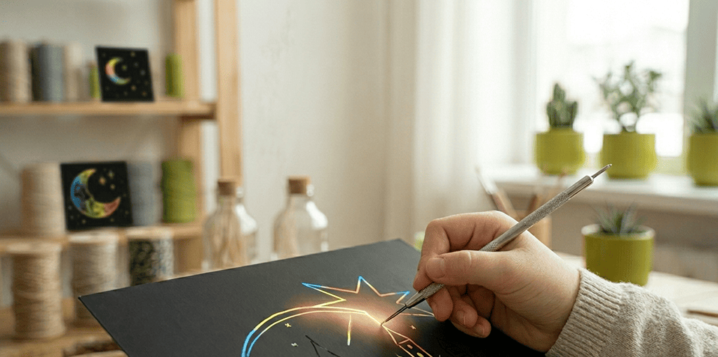 Это волшебная техника, когда под черной маскировочной краской скрываются яркие цвета. Острым инструментом процарапываются линии, и из темноты рождается светящийся, контрастный рисунок.